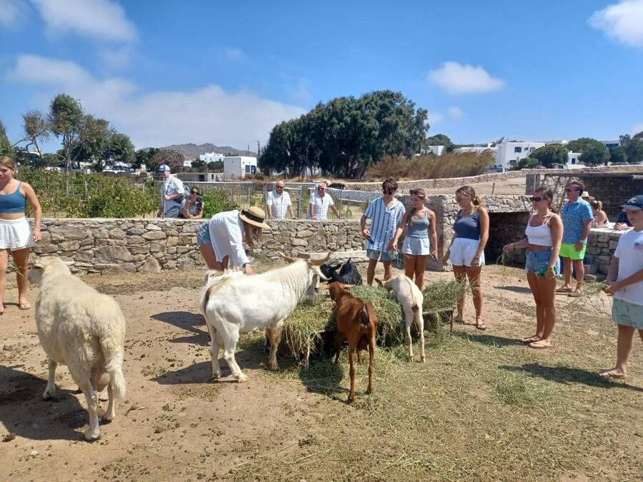 The tour continues at the Mykonian Farm, where you will experience the island’s rural charm firsthand. Enjoy a short 10–15 minute presentation on local wine production, learning about Mykonos’ viticulture history, grape varieties, and traditional winemaking techniques. For those interested, a light snack featuring local farm products is available.
